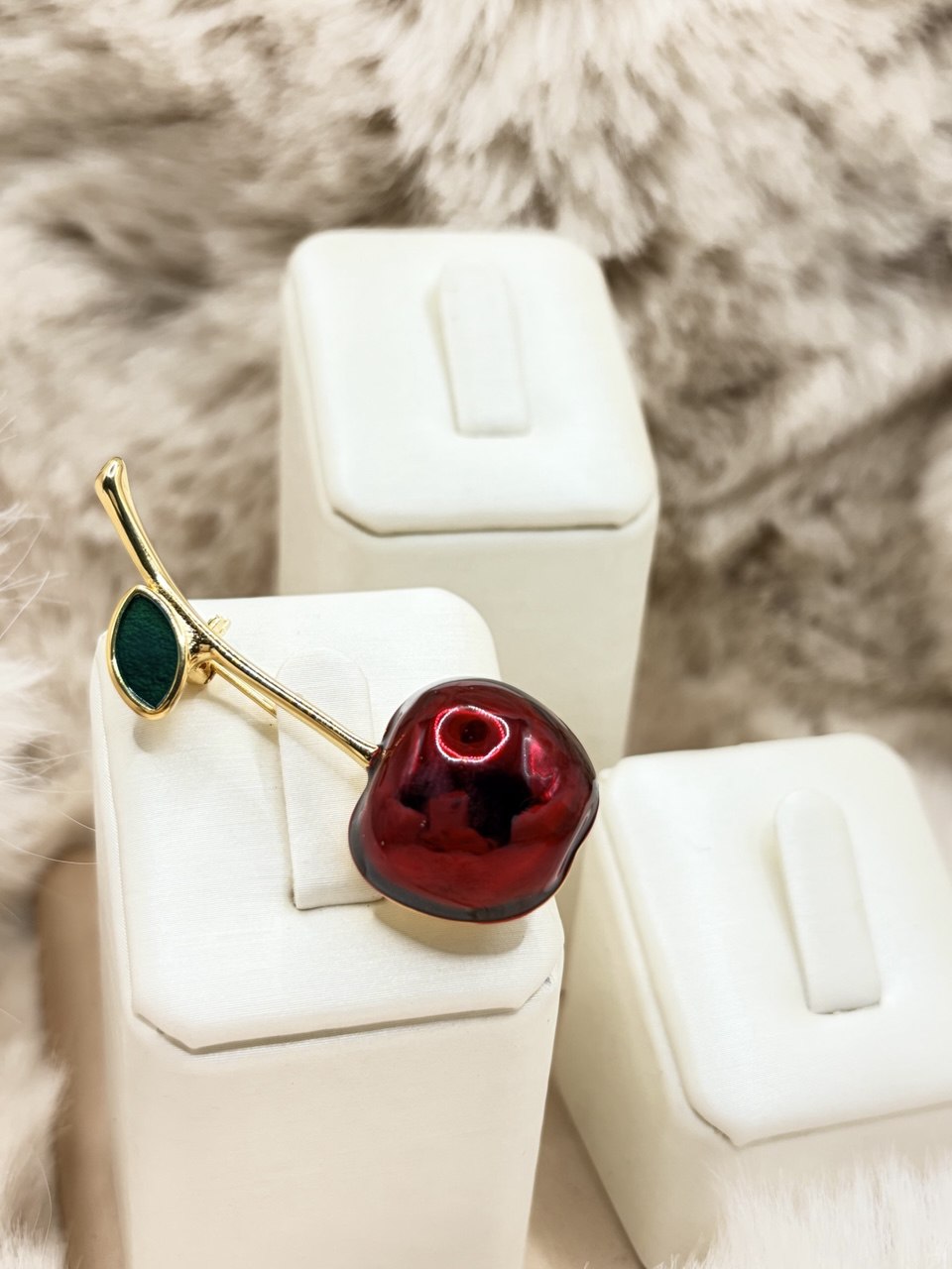 El tallo está confeccionado en acero inoxidable, la hoja decorativa está realizada en metal esmaltado en color verde y el fruto con acabado glossy imita el brillo natural de la cereza madura.