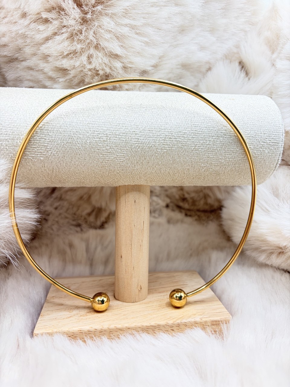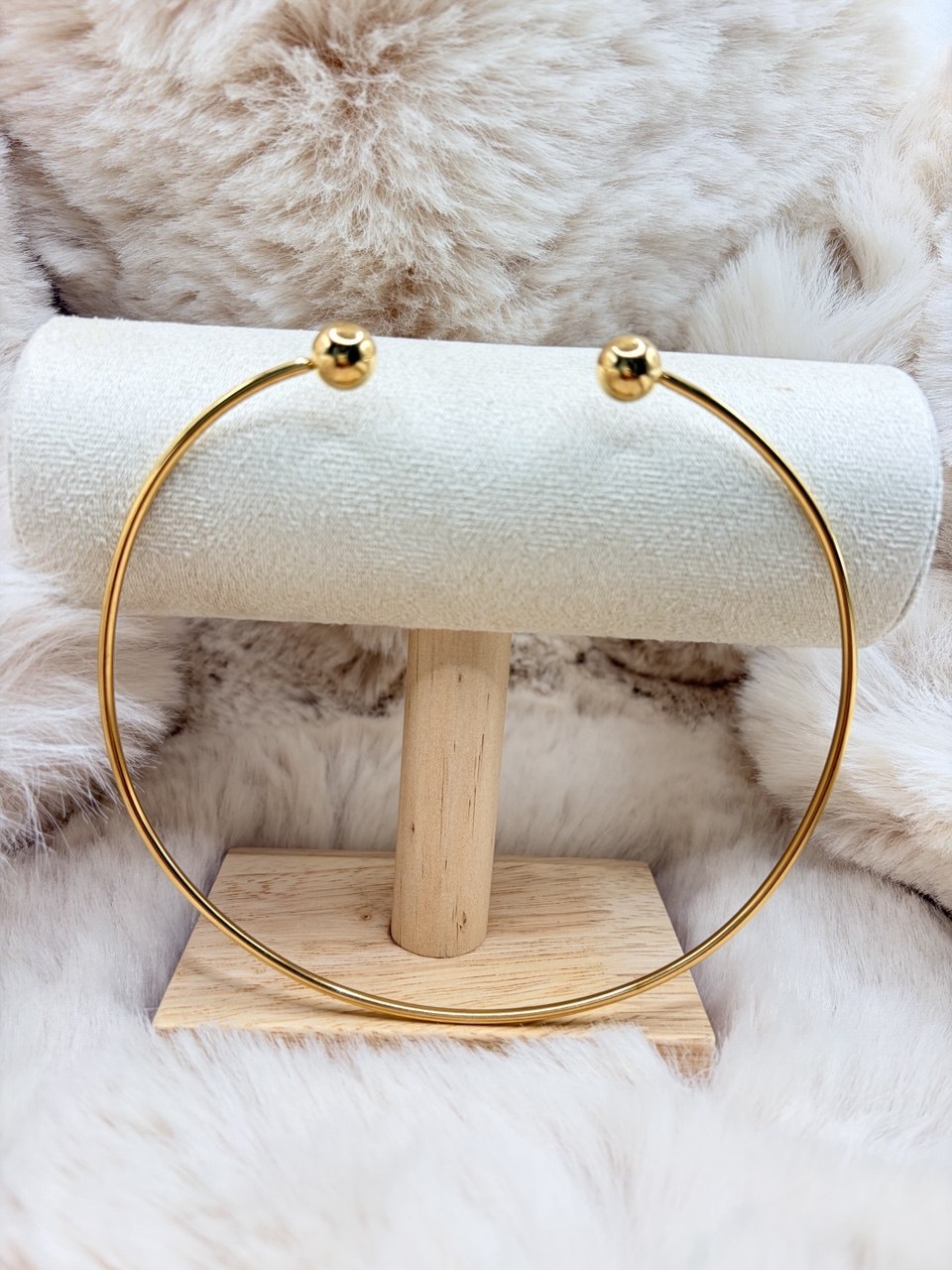 Elaborado con acero inoxidable, su diseño es rígido con forma semicircular que abraza el contorno del cuello.