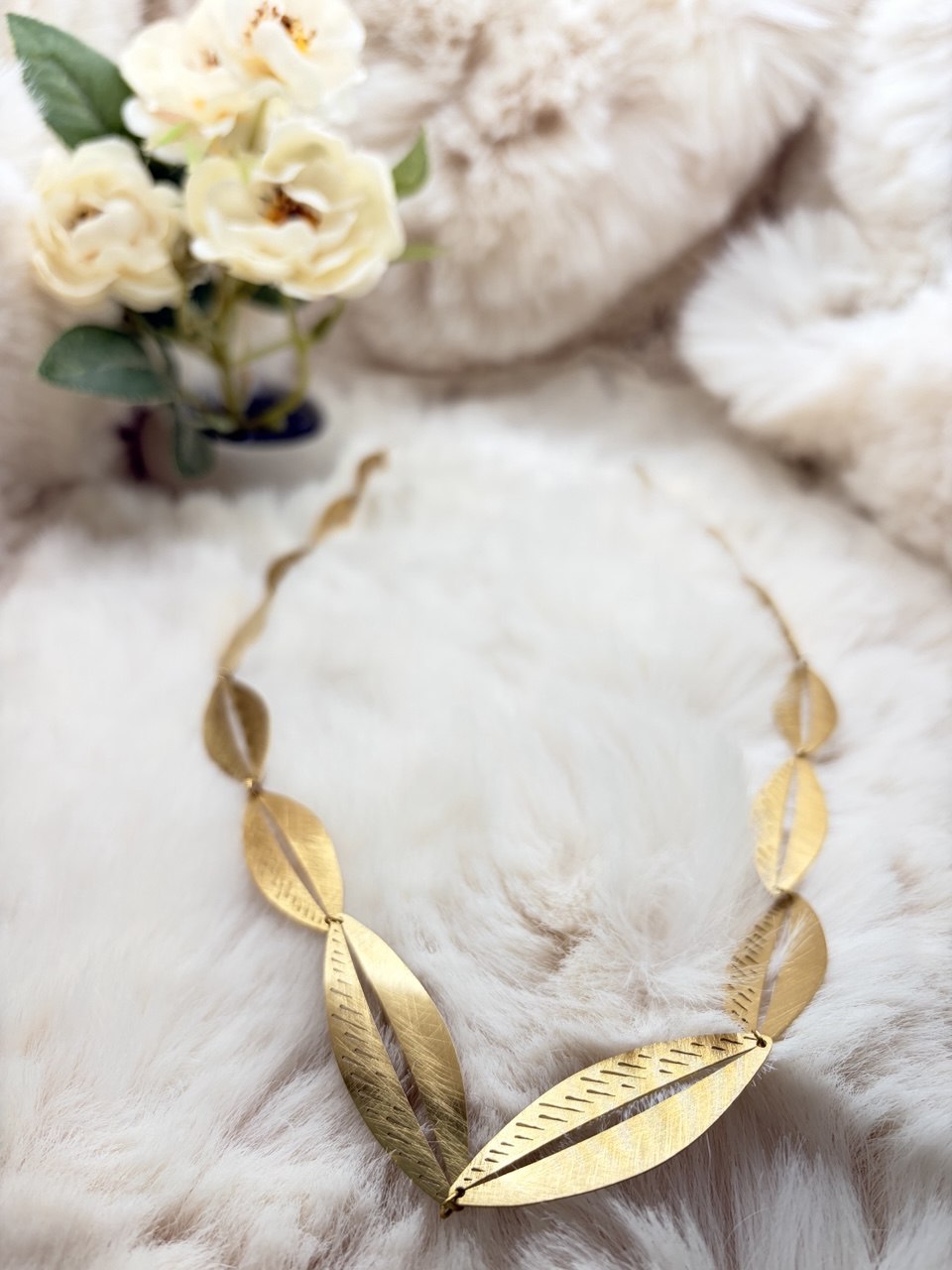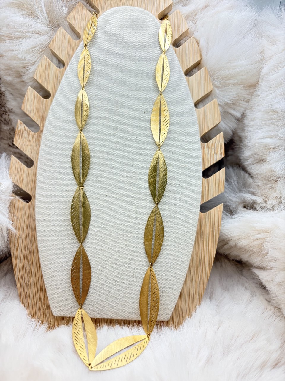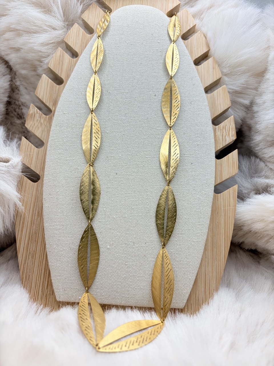 Este collar está compuesto por una serie de hojas doradas en acero inoxidable conectadas entre sí en una disposición simétrica. Cada hoja presenta un grabado fino en la superficie, con líneas que imitan el nervado natural.