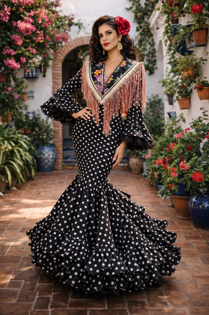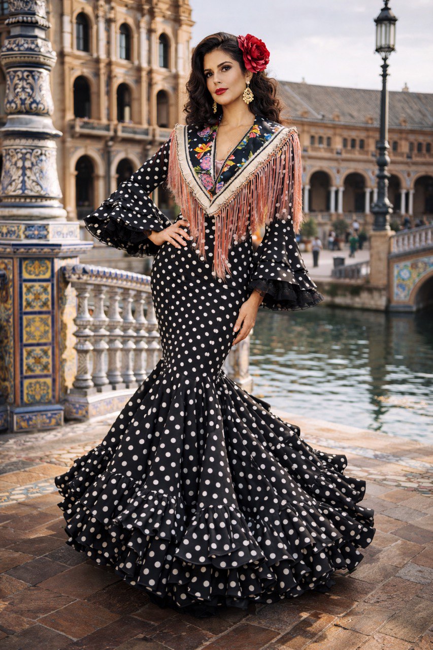 Vestido de flamenca negro con lunares blancos, de corte entallado que realza la silueta y falda con volantes de gran caída y movimiento. Un diseño sofisticado y muy flamenco, perfecto para brillar en feria.