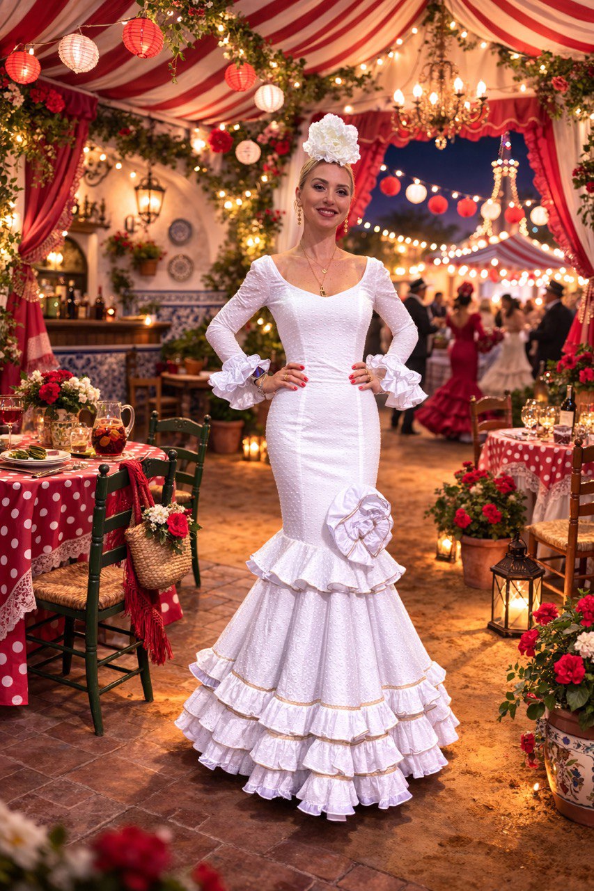 La falda, con volante estructurado y detalle floral lateral, realza el carácter del conjunto, creando una imagen limpia, refinada y muy favorecedora. Un diseño luminoso y atemporal, perfecto para una flamenca que apuesta por la elegancia con personalidad propia.