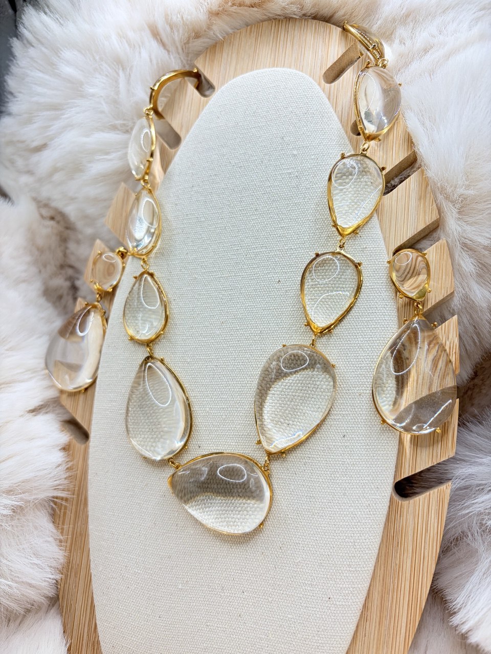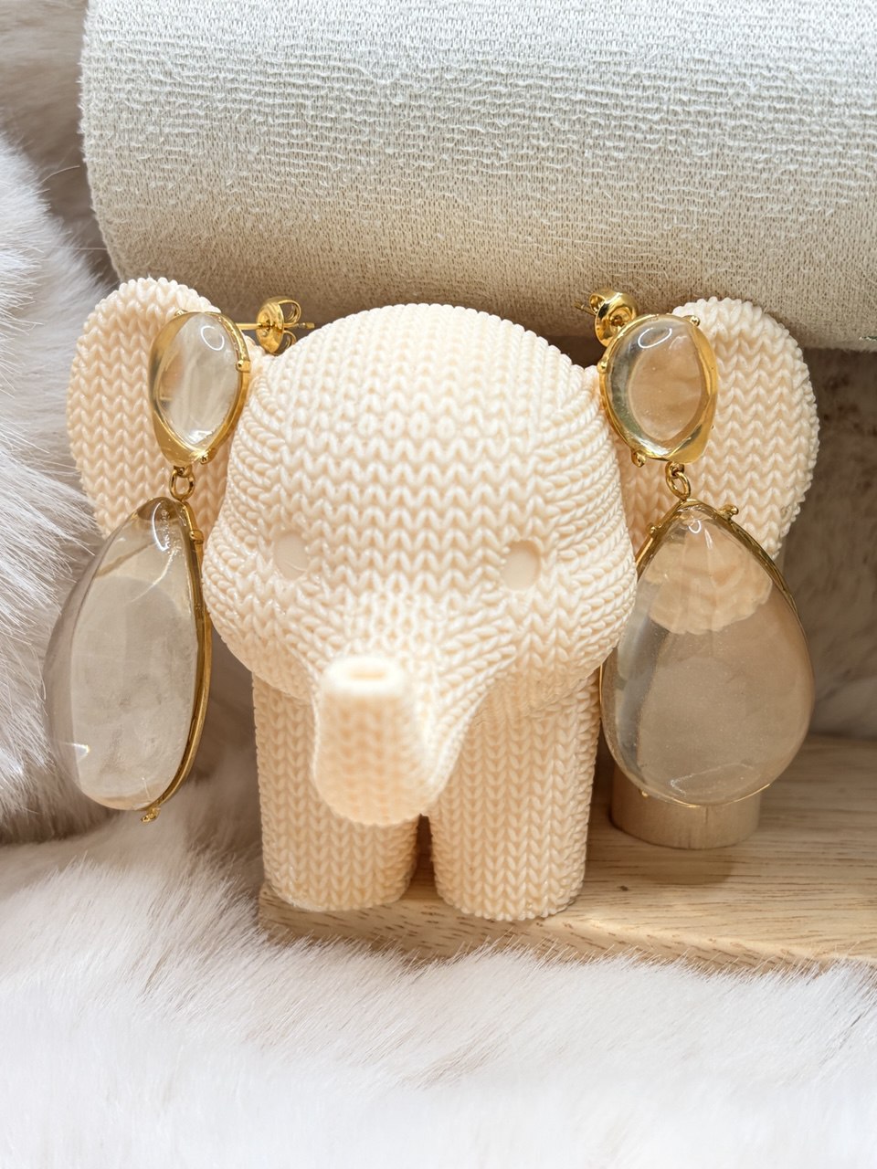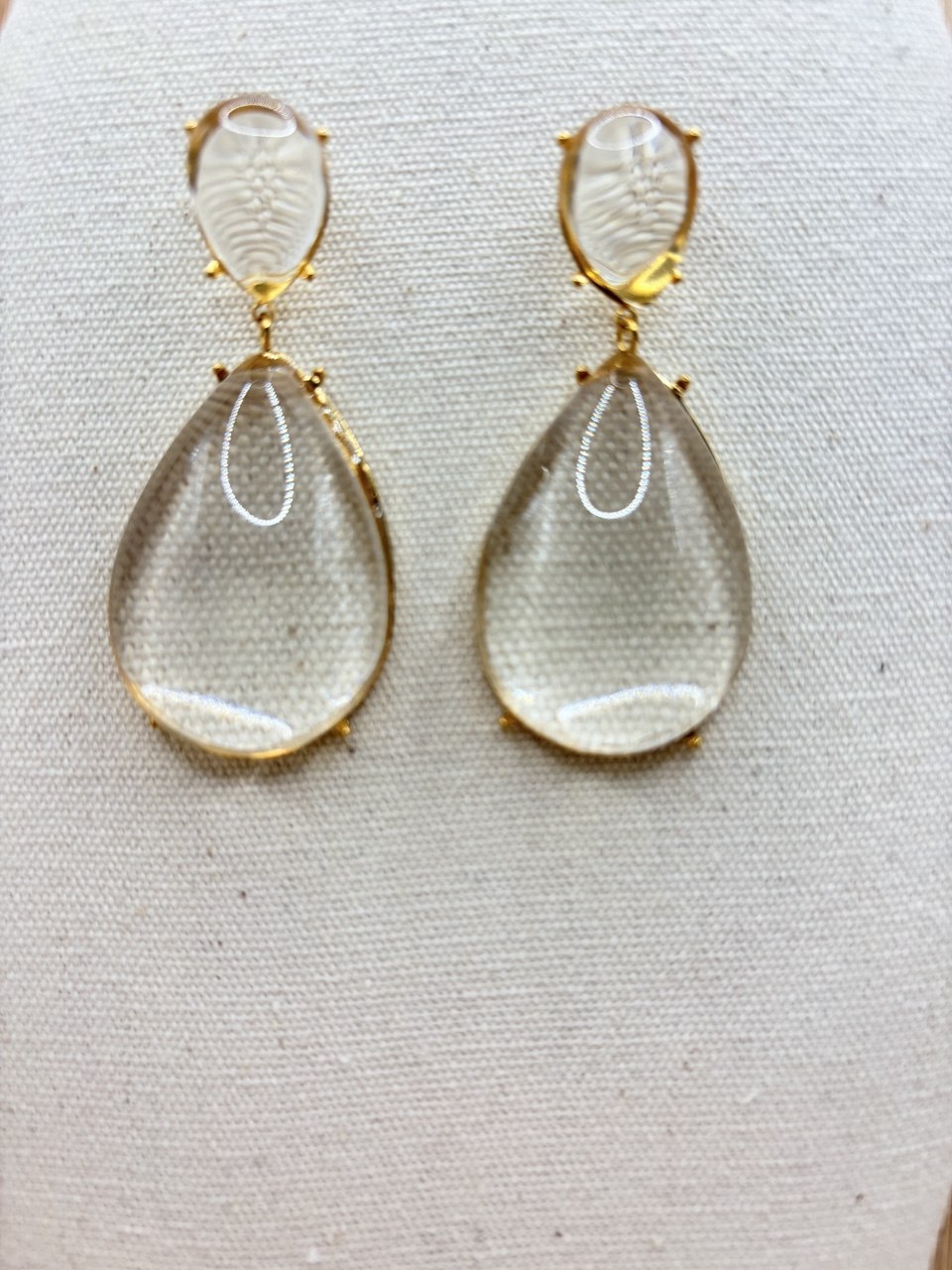 Con forma de lágrima, cada pendiente presenta una piedra translúcida de resina facetada.