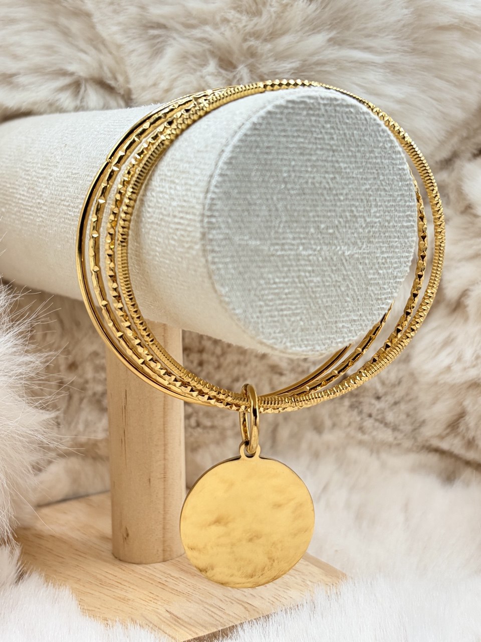 Conjunto de varias piezas en acero inoxidable color dorado de la mayor calidad. Cada pieza tiene un acabado distinto y están engarzadas con un medallón redondo y plano.